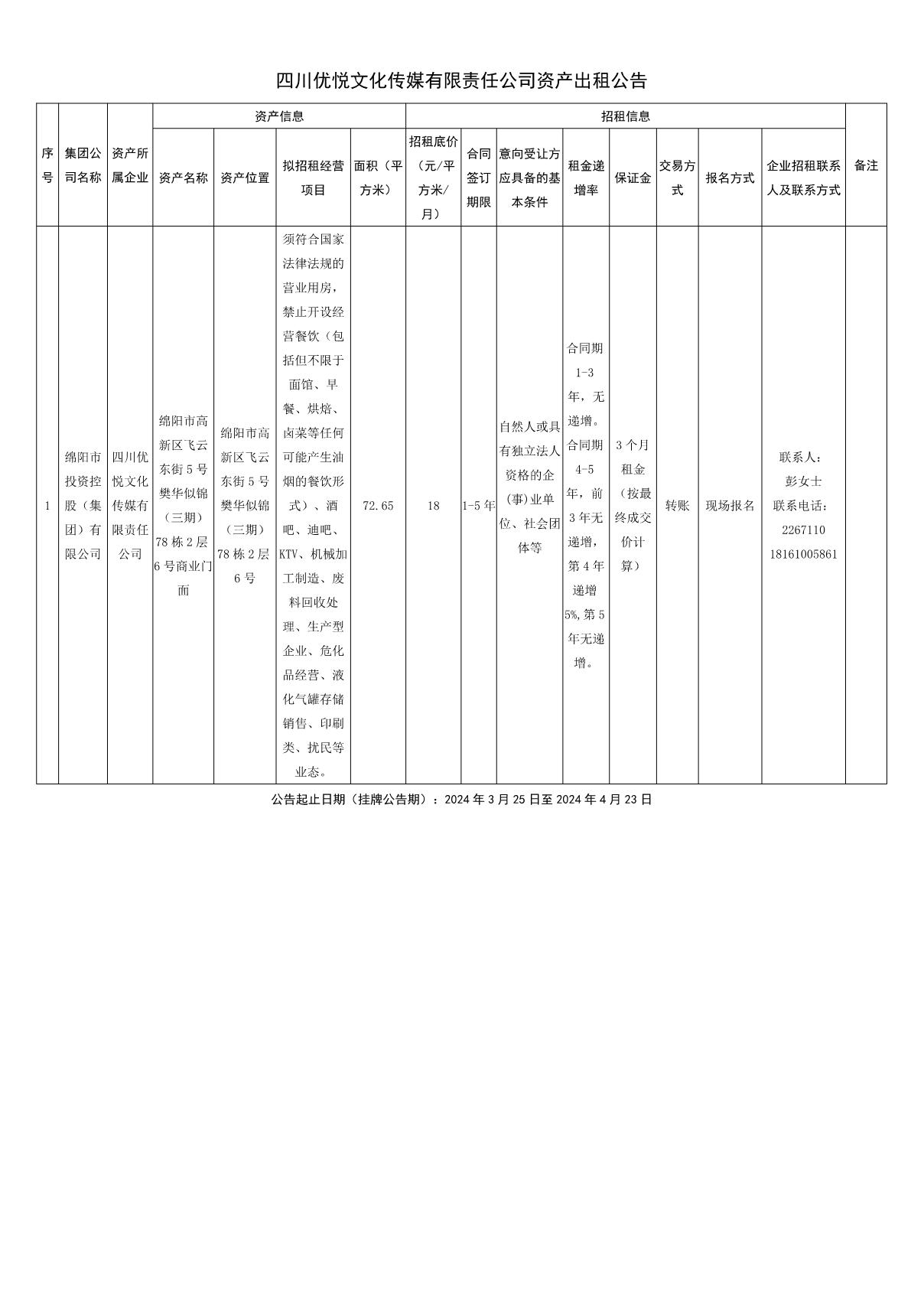 四川優(yōu)悅文化傳媒有限責(zé)任公司資產(chǎn)出租公告
