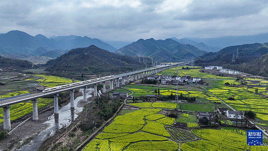 3月26日,池黃高鐵試運(yùn)行列車(chē)行駛在黃山市黃山區(qū)焦村鎮(zhèn)境內(nèi)(無(wú)人機(jī)照片)。新華社發(fā)(樊成柱攝)