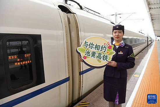 3月26日,池黃高鐵試運(yùn)行列車(chē)乘務(wù)員在黃山北站歡迎乘客。新華社記者 劉軍喜 攝