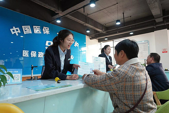 在重慶市北碚區(qū)歇馬街道醫(yī)保政務(wù)服務(wù)分中心,工作人員在給居民講解醫(yī)保政策。新華社發(fā)(秦廷富 攝)