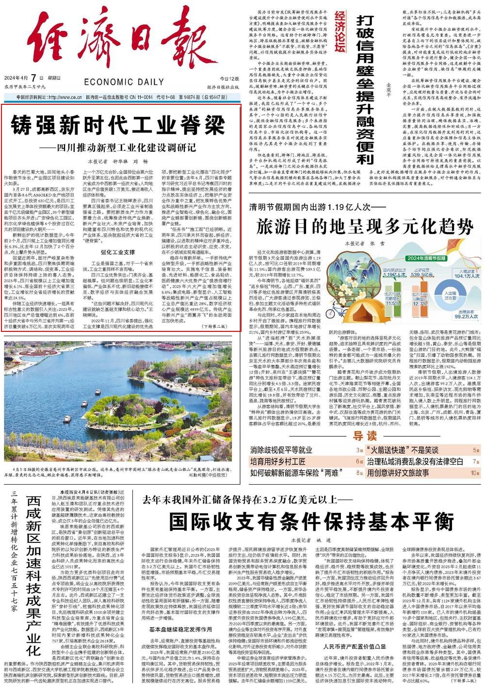 4月7日出版的《經(jīng)濟(jì)日?qǐng)?bào)》在頭版頭條以《鑄強(qiáng)新時(shí)代工業(yè)脊梁——四川推動(dòng)新型工業(yè)化建設(shè)調(diào)研記》為題,報(bào)道了四川加快構(gòu)建富有四川特色和優(yōu)勢(shì)的現(xiàn)代化產(chǎn)業(yè)體系,堅(jiān)決挺起經(jīng)濟(jì)大省的工業(yè)“硬脊梁”。