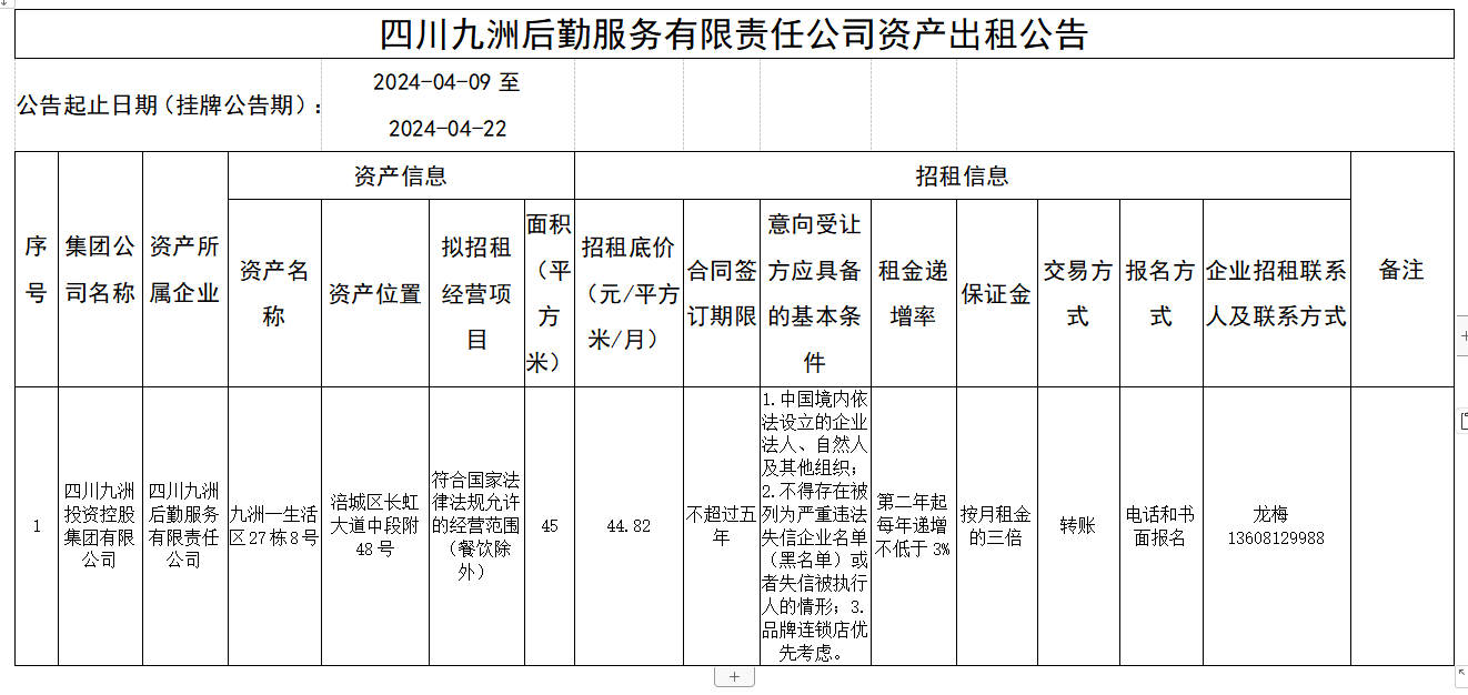 四川九洲后勤服務(wù)有限責(zé)任公司資產(chǎn)出租公告