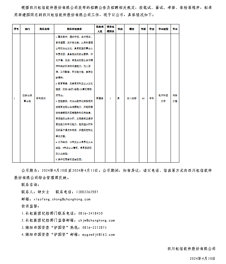 四川虹信軟件股份有限公司關(guān)于招聘咨詢顧問(wèn)崗位擬錄用人員的公示