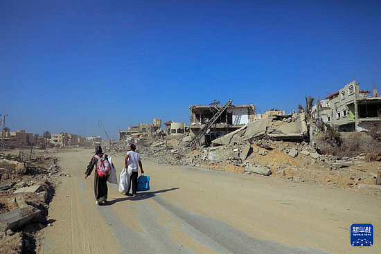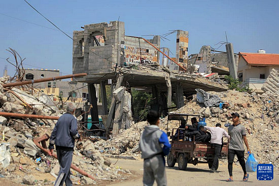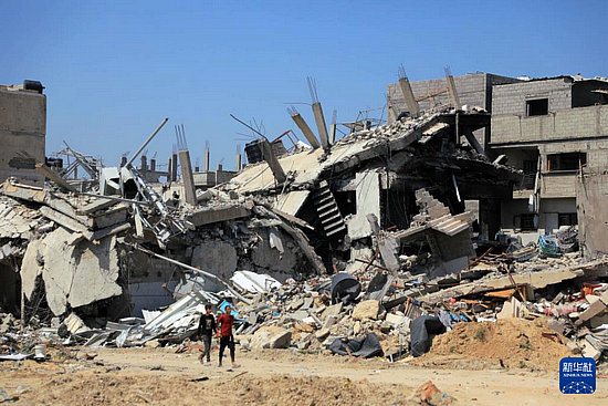 4月16日,在加沙地帶南部城市汗尤尼斯,人們走過(guò)損毀的建筑。新華社發(fā)(里澤克·阿卜杜勒賈瓦德攝)