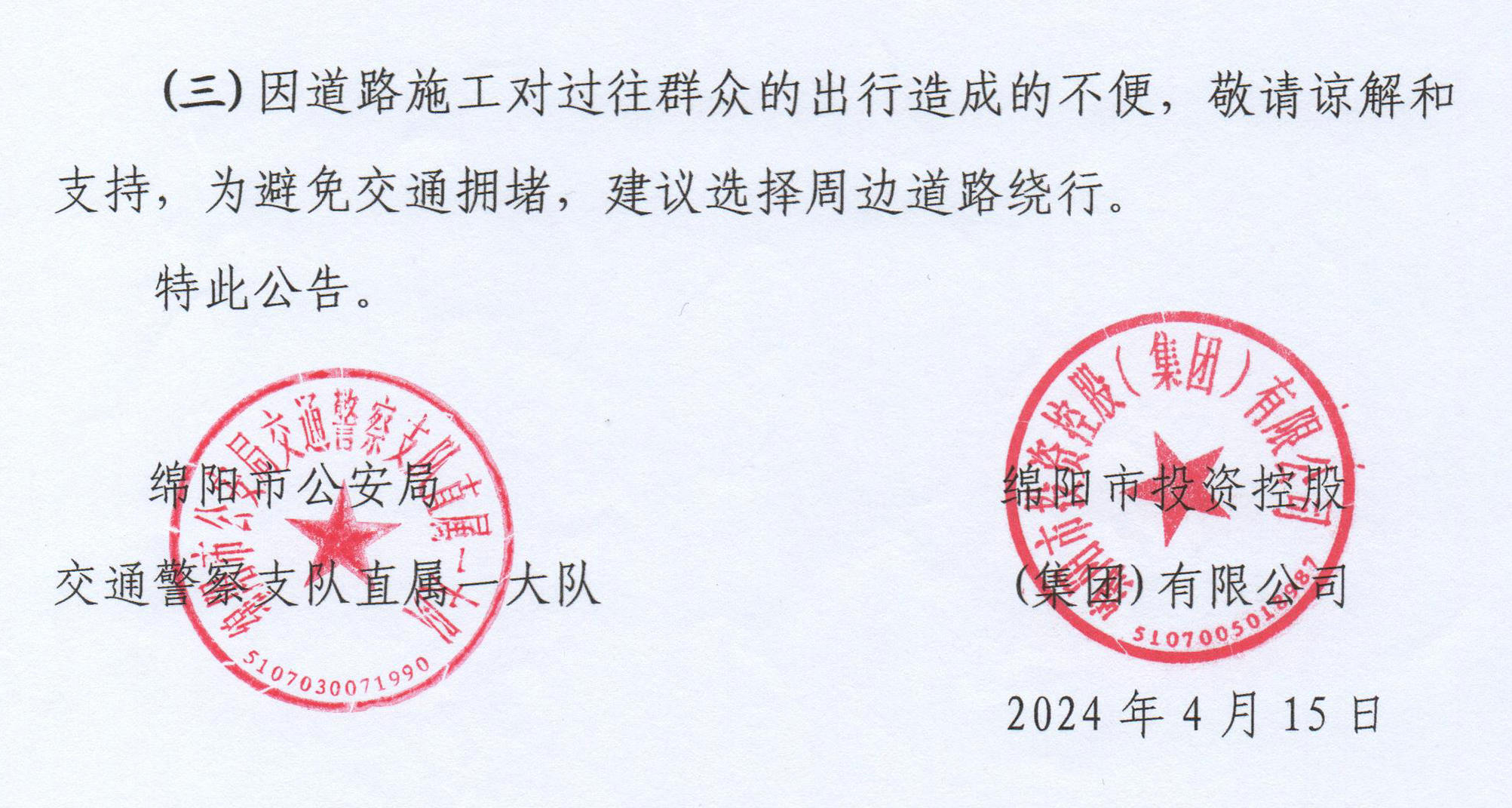 (三)因道路施工對(duì)過(guò)往群眾的出行造成的不便,敬請(qǐng)諒解和支持,為避免交通擁堵,建議選擇周邊道路繞行。