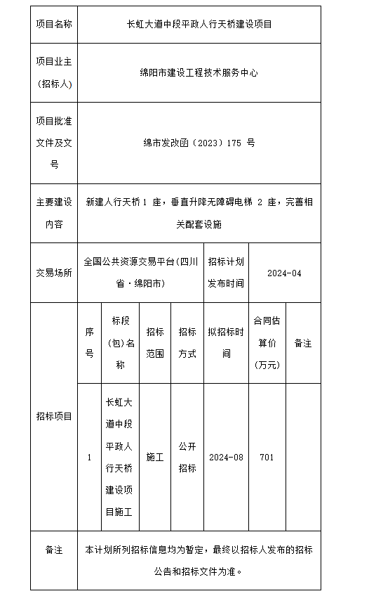 長(zhǎng)虹大道中段平政人行天橋建設(shè)項(xiàng)目招標(biāo)計(jì)劃表