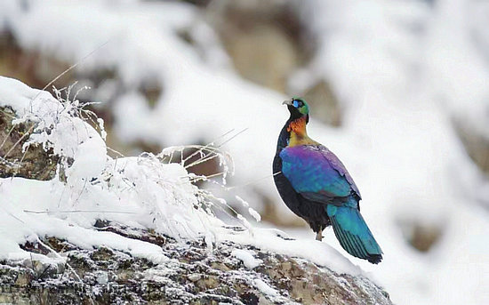 雪地上的綠尾虹雉 (冉亨軍 攝)