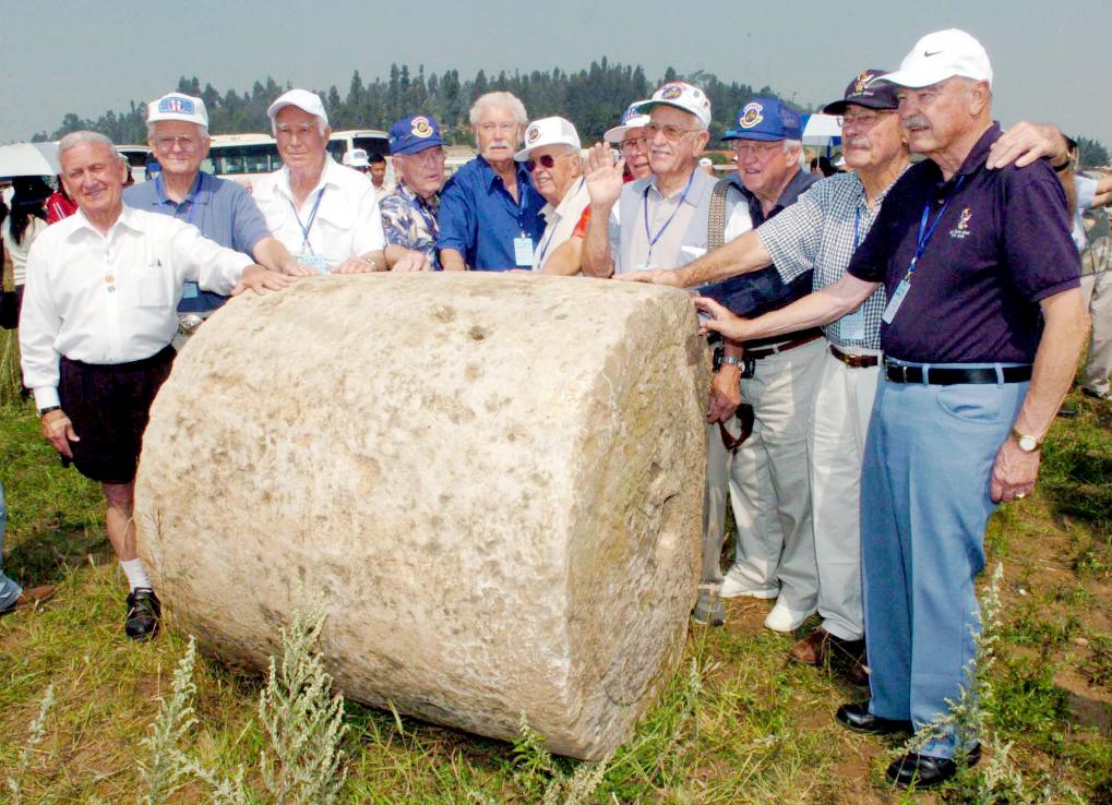 2005年9月10日,在中國昆明呈貢機(jī)場(chǎng),美國“飛虎隊(duì)”老兵和“飛虎隊(duì)”訪華團(tuán)成員在二戰(zhàn)期間修機(jī)場(chǎng)時(shí)用于碾壓跑道的石碾前合影。(新華社記者王長山攝)