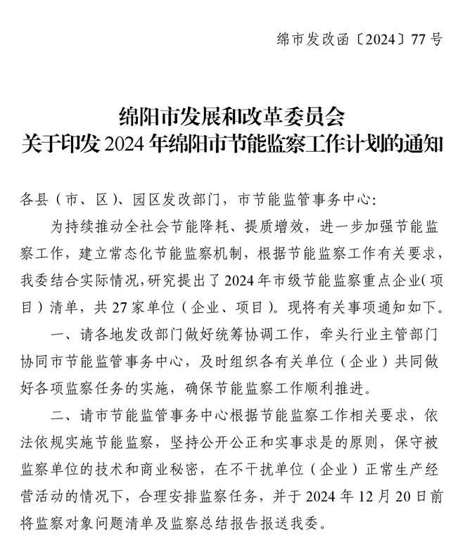 綿陽市發(fā)展和改革委員會關(guān)于印發(fā)2024年綿陽市節(jié)能監(jiān)察工作計劃的通知