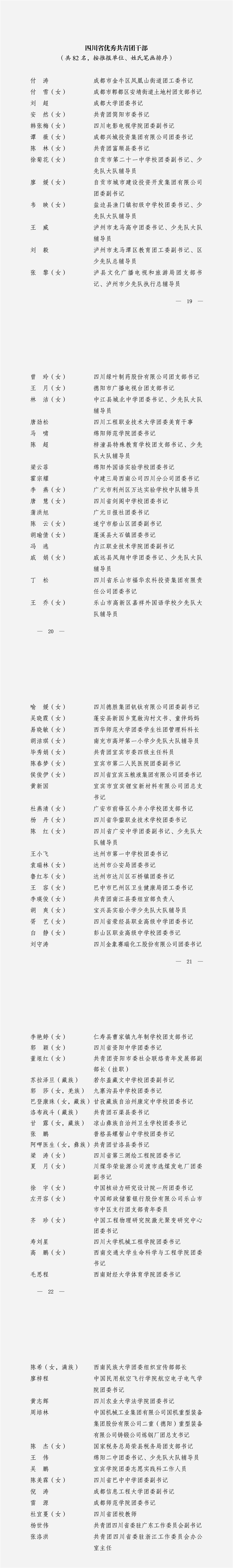 4月29日,記者從共青團(tuán)四川省委獲悉,五四青年節(jié)即將到來之際,為表彰先進(jìn)、樹立典型,共青團(tuán)四川省委、四川省人力資源和社會(huì)保障廳決定,授予四川省綿陽南山中學(xué)團(tuán)委等團(tuán)組織四川省五四紅旗團(tuán)委稱號(hào),授予北川羌族自治縣曲山鎮(zhèn)石椅村團(tuán)支部等團(tuán)組織四川省五四紅旗團(tuán)支部稱號(hào),授予綿陽市涪城區(qū)蒲公英應(yīng)急救援中心城市搜救隊(duì)副隊(duì)長(zhǎng)李桂蘭等四川省優(yōu)秀共青團(tuán)員稱號(hào),授予綿陽師范學(xué)院團(tuán)委書記馬嘯等四川省優(yōu)秀共青團(tuán)干部稱號(hào)。