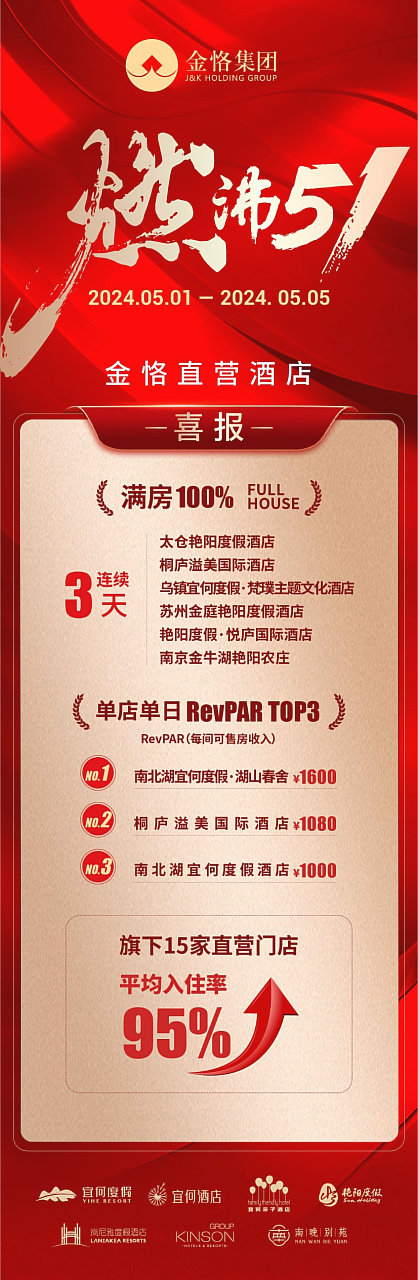5月1日-5日,集團(tuán)旗下太倉艷陽度假酒店、桐廬溢美國際酒店、烏鎮(zhèn)宜何度假·梵璞主題文化酒店、蘇州金庭艷陽度假酒店、艷陽度假·悅廬國際酒店、南京金牛湖艷陽農(nóng)莊等直營酒店連續(xù)3天滿房率100%。