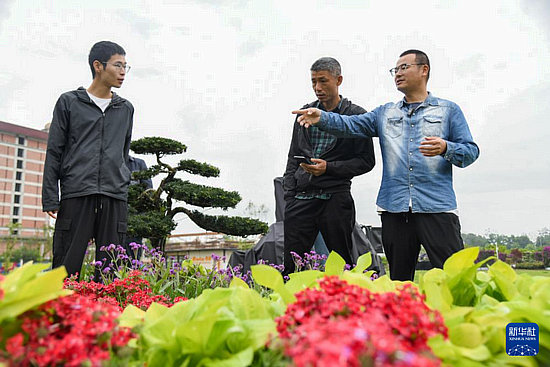 4月23日,在成都世園會(huì)溫江分會(huì)場(chǎng),陳宏宇(右)和同事交流討論盆景擺放位置。