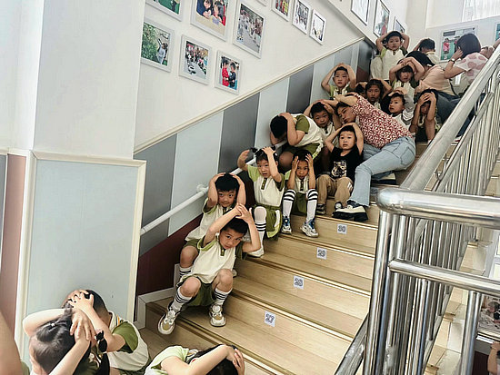點,警報聲響起。全體幼兒在老師的組織下迅速躲避,按照班級應急路線疏散。特警叔叔分別在幼兒園的樓梯轉角和安全出口等位置給予幼兒引導和護航。警園共護下,所有幼兒安全有序疏散到操場。
