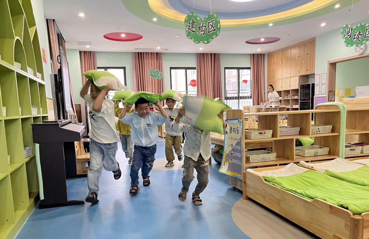 隨著第二聲警報聲響起,幼兒在老師的帶領(lǐng)下彎腰、護頭,迅速且有序沿著指定疏散路線撤離到安全區(qū)域,同時安保人員檢查是否有掉隊的孩子,確保每位幼兒安全撤離。