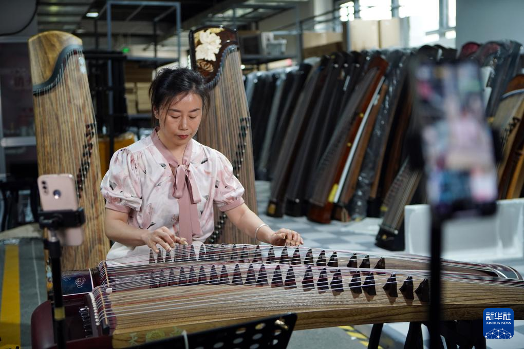 5月13日,蘭考天中樂器有限公司的工作人員通過網絡直播帶貨的方式銷售古箏。