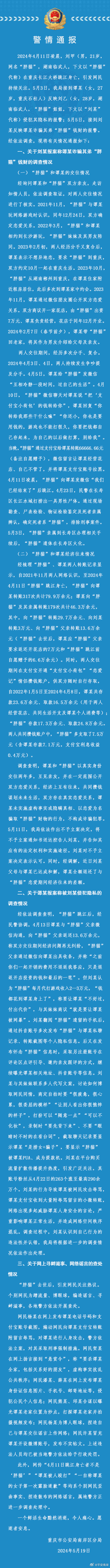 5月19日,重慶警方發(fā)布關(guān)于劉某(男,21歲,網(wǎng)名“胖貓”)在重慶長江大橋跳江身亡事件相關(guān)情況的通報。內(nèi)容如下:
