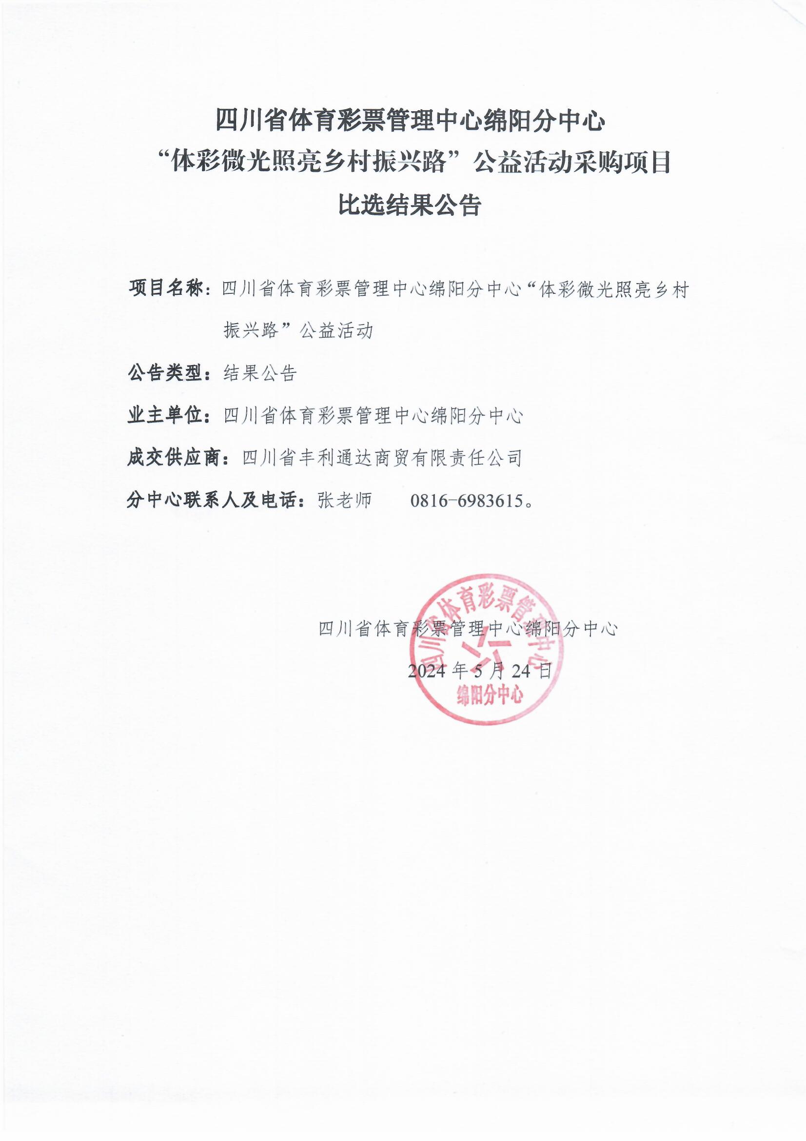 四川省體育彩票管理中心綿陽分中心“體彩微光照亮鄉(xiāng)村振興路”公益活動采購項目比選結(jié)果公告