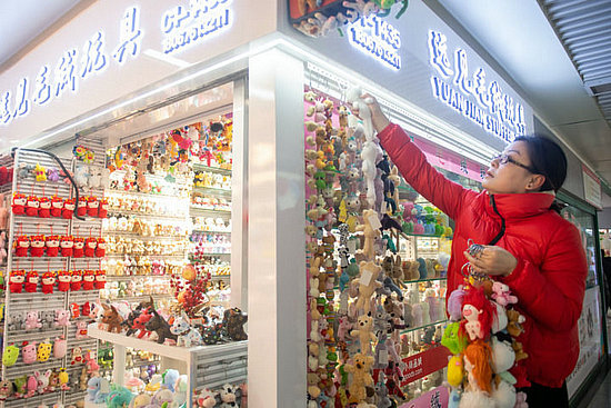 2月21日,義烏國際商貿(mào)城經(jīng)營戶整理展示樣品。新華社記者江漢 攝