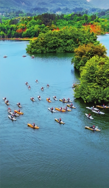 位于雎水鎮(zhèn)的人間瑤池白水湖,湖中有大小島嶼23個(gè),星羅棋布,像寶石一樣鑲嵌在清澈的碧波之上。建筑與自然完美融合的白水湖游客中心、多元業(yè)態(tài)集合的空間觀湖小館、臨水開放的沙汀書屋,看書、喝茶、餐飲、聊天、小憩……