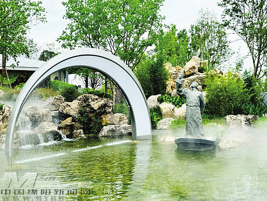 綿陽展園位于世園會天府人居展區(qū)核心區(qū),總占地面積約3000平方米,通過“詩仙鏡湖、澗溪潺流、綿州攬勝”三大臺地空間布局,嵌入展示“一石、一人、一草”三寶,在有限空間范圍內(nèi)呈現(xiàn)了一幅融合詩仙浪漫情懷和綿州秀美生態(tài)的西蜀園林畫卷。