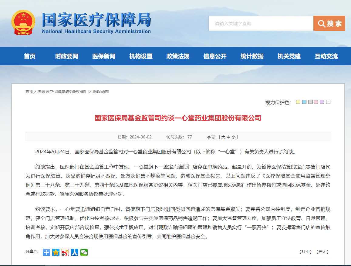 近日,國家醫(yī)保局基金監(jiān)管司對一心堂藥業(yè)集團股份有限公司(以下簡稱“一心堂”)有關負責人進行了約談。