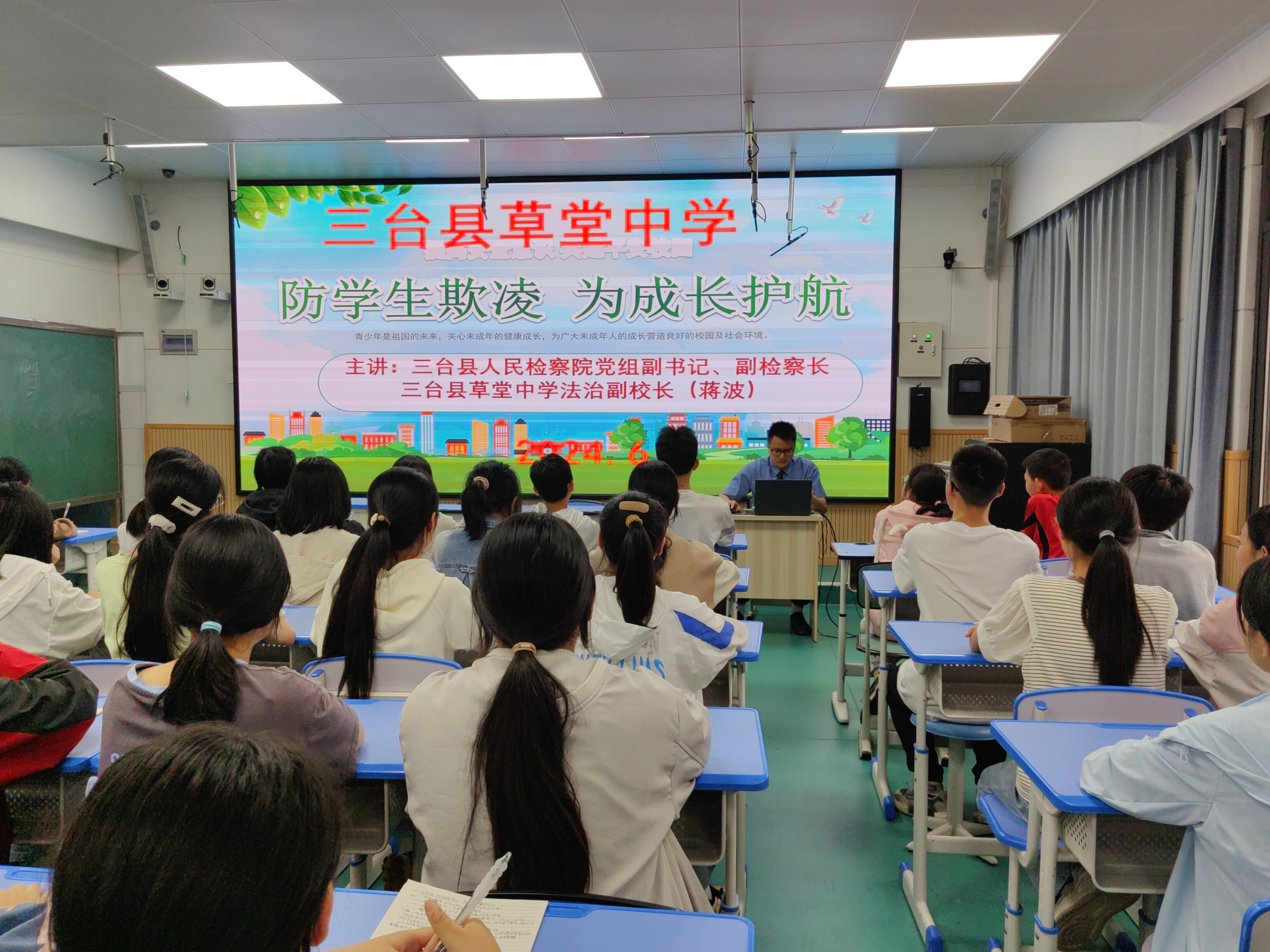6月5日,三臺(tái)縣草堂中學(xué)特邀縣人民檢察院黨組副書記、副檢察長(zhǎng)、學(xué)校法治副校長(zhǎng)蔣波來(lái)校,開(kāi)展了以“防學(xué)生欺凌,為成長(zhǎng)護(hù)航”為主題的2024年春法治專題宣講活動(dòng)。