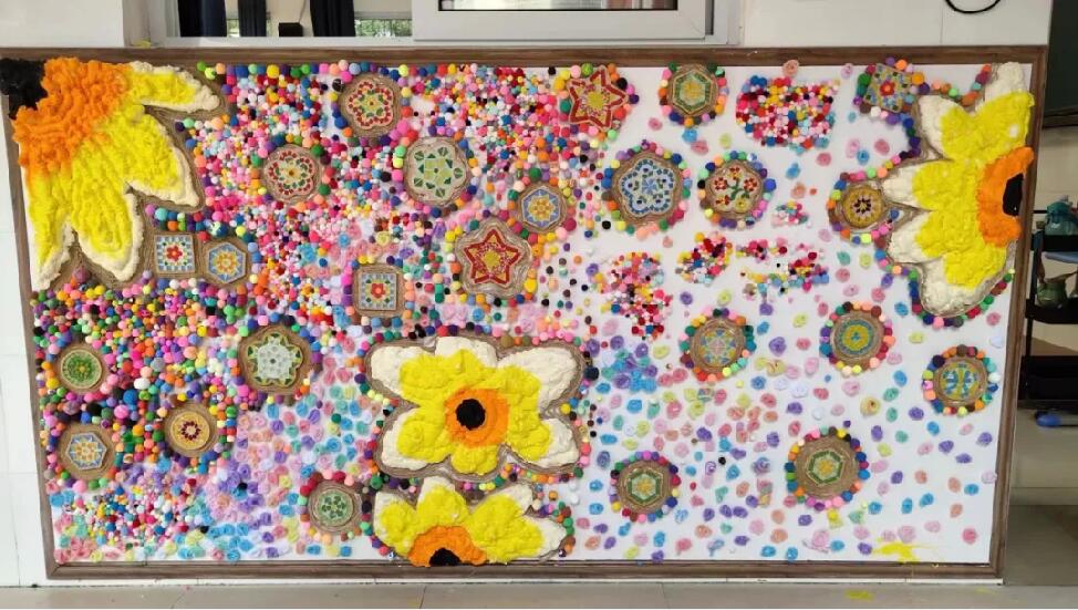 一年級(jí)外墻主題為《向日葵》,是通過(guò)發(fā)泡劑、超輕黏土、毛線球、馬賽克、扭扭棒等材質(zhì)制作而成。整個(gè)設(shè)計(jì)將一年級(jí)下冊(cè)課本第二課《長(zhǎng)啊長(zhǎng)》與活動(dòng)課項(xiàng)目二《點(diǎn)的構(gòu)成》相結(jié)合,將理論知識(shí)與實(shí)際生活相結(jié)合,既遵循了學(xué)生的生長(zhǎng)發(fā)展規(guī)律,又表達(dá)了學(xué)校希望學(xué)生“內(nèi)心有暖、席光而坐、向陽(yáng)而生、逐光而行”的美好愿景。