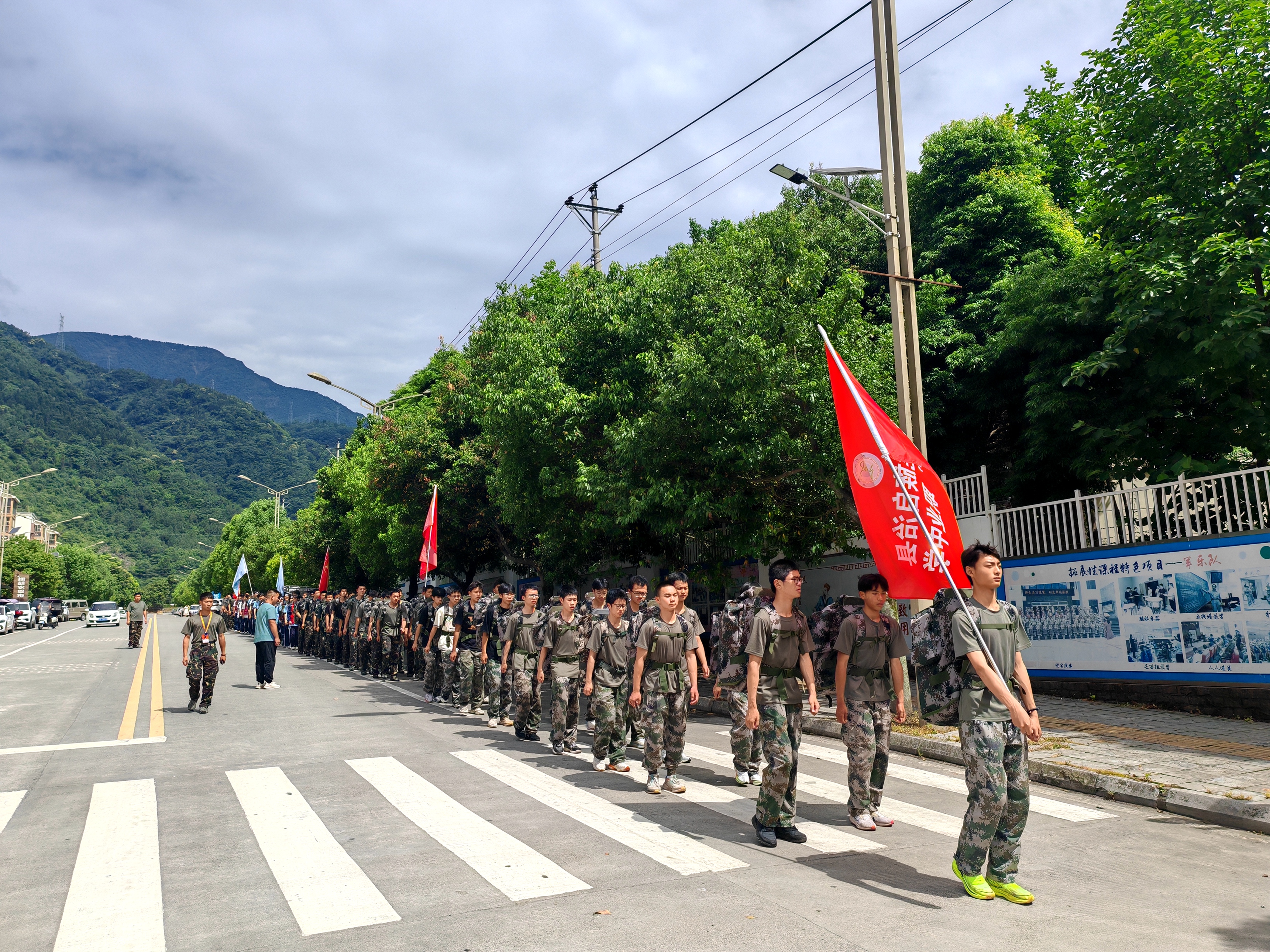 全體師生精神抖擻,邁著鏗鏘有力的步伐,向目的地挺進(jìn)。一路上,綠色的迷彩綿延成一條長龍,同學(xué)們服從指揮、嚴(yán)守紀(jì)律、互助友愛,把嘹亮的歌聲和良好的風(fēng)貌留在了沿途的大街小巷中,也引來沿途人們贊許的目光。