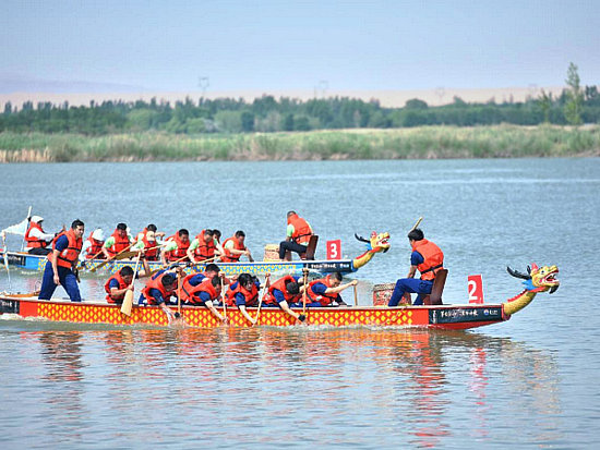 6月9日,龍舟隊伍在寧夏中衛(wèi)市金沙島舉辦的龍舟爭霸賽上競渡。新華社發(fā)