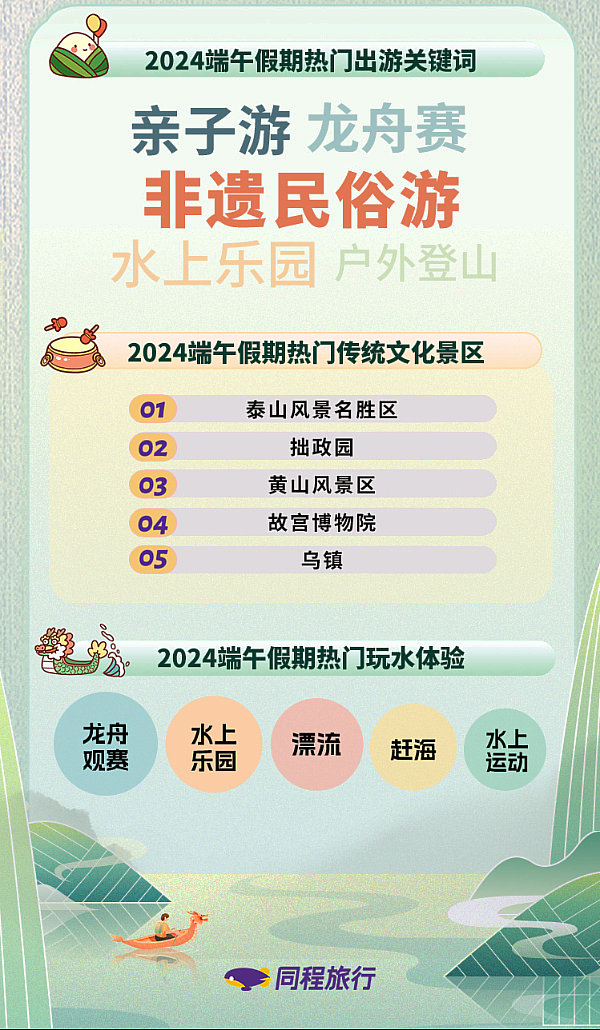 據(jù)了解,廣東、湖南、浙江、貴州、云南等地舉辦龍舟競渡。湖北武漢推出“漫游武漢”系列文化和旅游活動。河南通過非遺展演、端午習俗等沉浸式場景讓游客感受傳統(tǒng)文化魅力。安徽推出花戲樓里的情景劇、沉浸式微空間體驗劇等產(chǎn)品。江蘇舉辦“水韻江蘇·樂購非遺”活動。各地還將傳統(tǒng)民俗、民間藝術有機融入博物館、美術館、圖書館、戲劇場、電影院等文化空間,豐富了文旅深入融合的新場景。根據(jù)同程旅行數(shù)據(jù)顯示,非遺民俗游、親子游、龍舟觀賽、水上樂園和戶外登山是端午假期最熱門的出游主題。