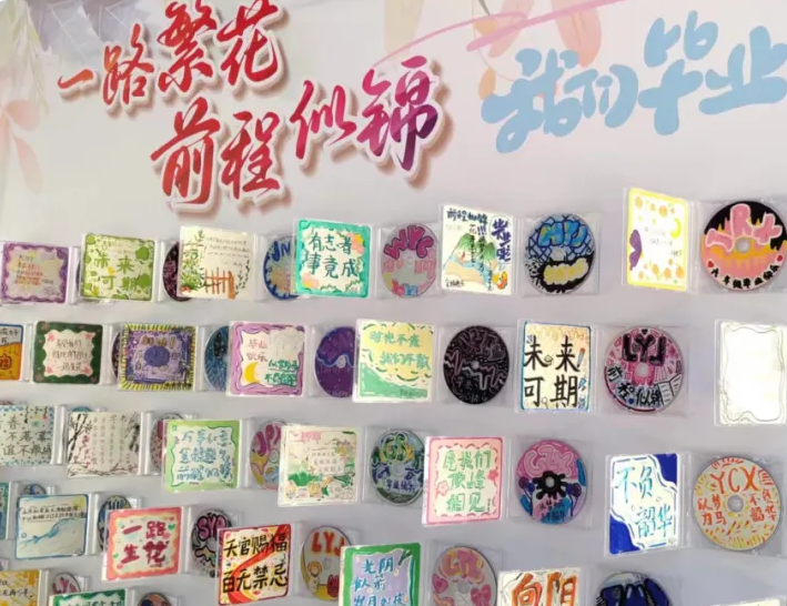 六年級(jí)的孩子們以“一路繁花,前程似錦”為主題,利用 CD光盤為材料,以桃花作封面,寓意孩子們?nèi)缡㈤_的桃花,內(nèi)側(cè)書寫畢業(yè)寄語(yǔ)和名字字母加上涂鴉繪畫,一張張小小的CD,寄予對(duì)母校的祝愿。