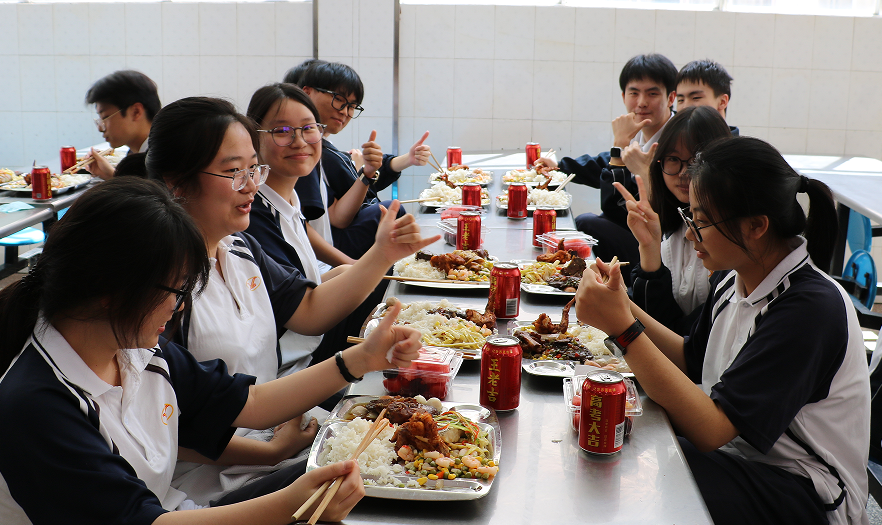 前程似錦(青豆炒蝦仁)、金榜題名(香辣豬蹄)、大鵬展翅(奧爾良雞翅)、牛氣沖天(紅燒牛肉)、連中三元(清燒丸子)、魚躍龍門(糖醋魚),這是江油一中為助力高考列出的菜譜。5月24日晚餐時間,江油一中開展了以“一中味道,祝福高三”為主題的高三學子贈餐活動,全體高三學生齊聚學校食堂,愉快地享用學校為他們贈送的一道道美食。