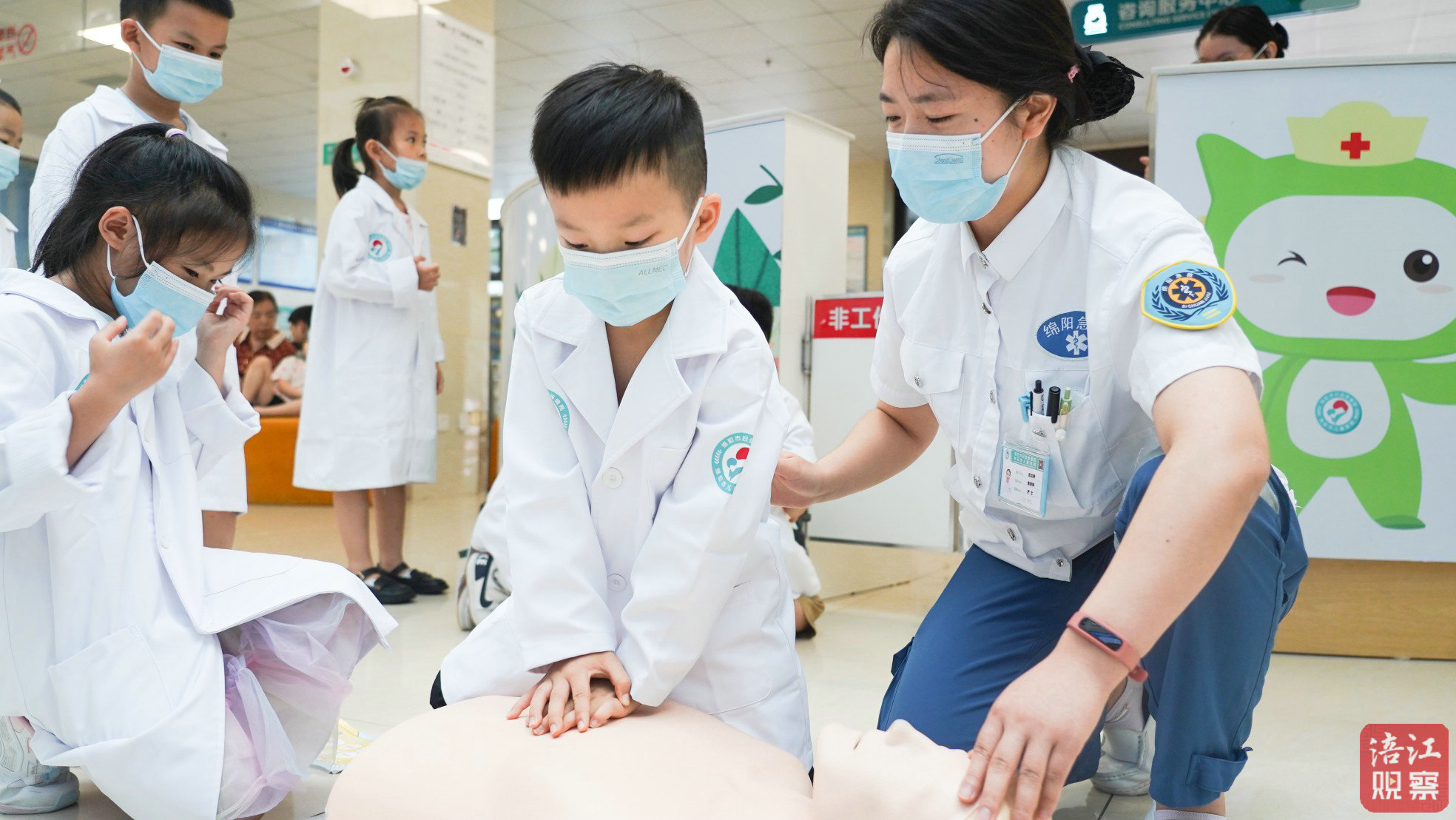 體驗(yàn)為同伴檢查視力,透過(guò)顯微鏡了解微觀世界,親手操作部分簡(jiǎn)單醫(yī)療器械,在模擬場(chǎng)景下體驗(yàn)心肺復(fù)蘇術(shù)(CPR)和海姆立克法等常見(jiàn)緊急救護(hù)措施……一場(chǎng)活動(dòng)下來(lái),“小醫(yī)生”們?cè)诨?dòng)和體驗(yàn)中感受到了醫(yī)生的日常工作,學(xué)習(xí)到了基礎(chǔ)健康知識(shí)。他們紛紛表示,“以后長(zhǎng)大了我也要當(dāng)醫(yī)生”“我也想治病救人”。