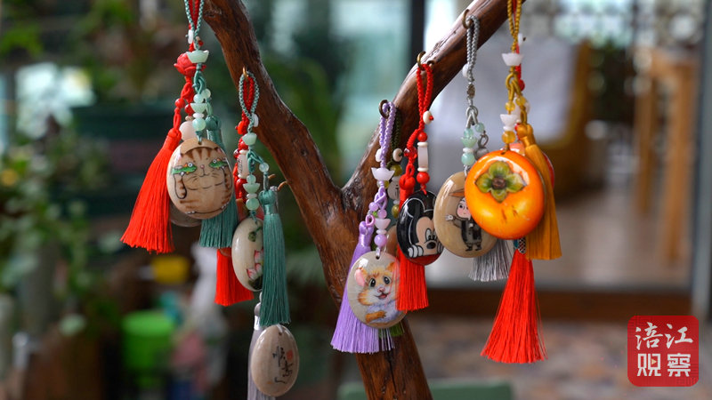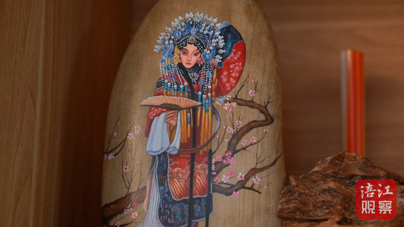 走進(jìn)張霞石藝工作室,環(huán)壁的櫥架上,風(fēng)光旖旎的山水、嬌艷無比的花草、雍容華麗的戲劇扮相、呆萌可愛的熊貓……從擺件到掛件、從吊墜到居家器物,石畫緣自形態(tài)各異的石頭,生動而細(xì)膩的繪畫功底令人驚嘆。