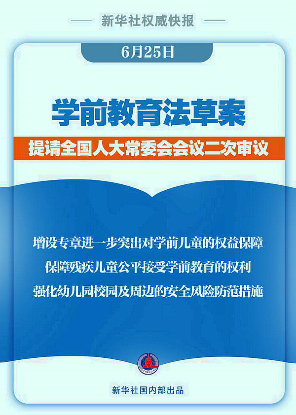 學(xué)前教育法草案6月25日提請(qǐng)全國人大常委會(huì)會(huì)議二次審議。