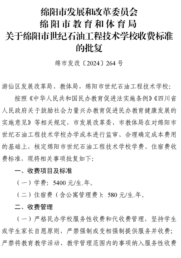 綿陽市發(fā)展和改革委員會(huì)綿陽市教育和體育局關(guān)于綿陽市世紀(jì)石油工程技術(shù)學(xué)校收費(fèi)標(biāo)準(zhǔn)的批復(fù)
