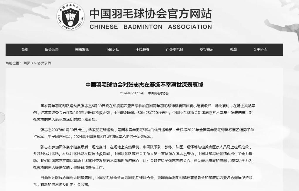 “我們對張志杰在國際賽場上比賽時突發(fā)疾病不幸離世深感痛心,對社會各界給予張志杰的關(guān)心、幫助表示由衷的感謝,將竭盡全力為張志杰的家人提供幫助,做好各項善后工作。”中國羽協(xié)在公告中寫道。