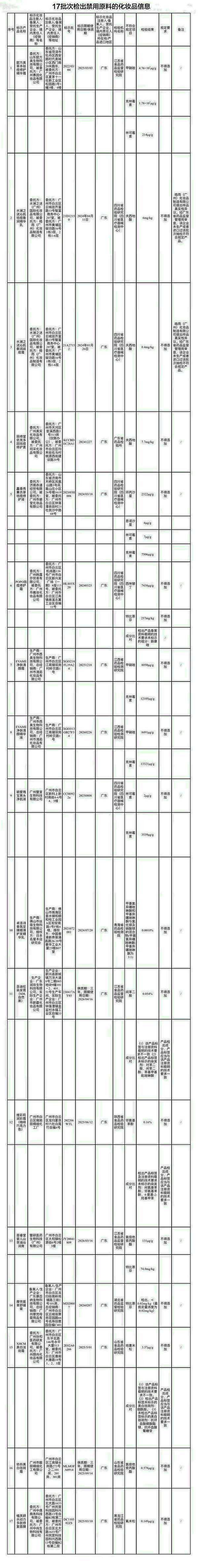 17批次不合格化妝品的具體信息如下圖所示,包括產(chǎn)品名稱、生產(chǎn)企業(yè)、被抽樣單位、包裝規(guī)格、標示批號以及不符合規(guī)定項目和檢驗結果等。其中,皓雨(廣州)化妝品制造有限公司提出樣品真實性異議。經(jīng)廣東省藥品監(jiān)督管理局審查,該企業(yè)未生產(chǎn)或者進口過該批次抽檢不符合規(guī)定產(chǎn)品。標示產(chǎn)品名稱為水瀾之迷沁肌祛痘衡潤精華乳、水瀾之迷沁肌衡潤戰(zhàn)痘霜。
