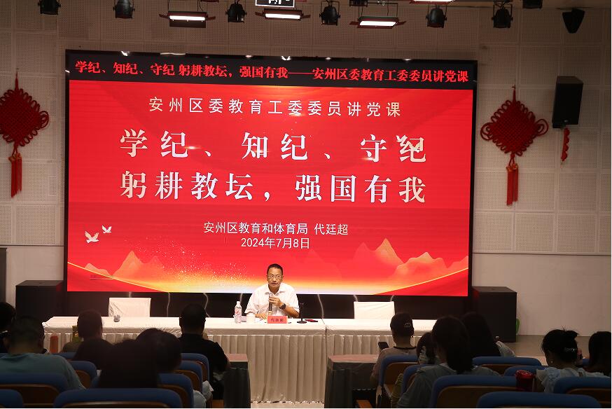 為了持續(xù)營(yíng)造學(xué)黨紀(jì)、知黨紀(jì)、守黨紀(jì)的濃厚氛圍,7月8日,安州區(qū)委教育工委班子成員講黨課——《學(xué)紀(jì)、知紀(jì)、守紀(jì) 躬耕教壇,強(qiáng)國(guó)有我》在。會(huì)議由“七一”實(shí)小黨總支書記陳九齡同志主持,“七一”實(shí)小、桑棗中學(xué)、桑棗鎮(zhèn)幼兒園等80余名黨員參加。