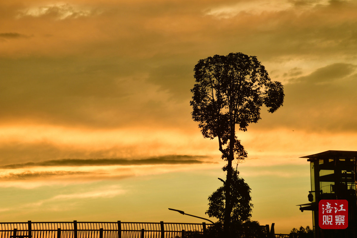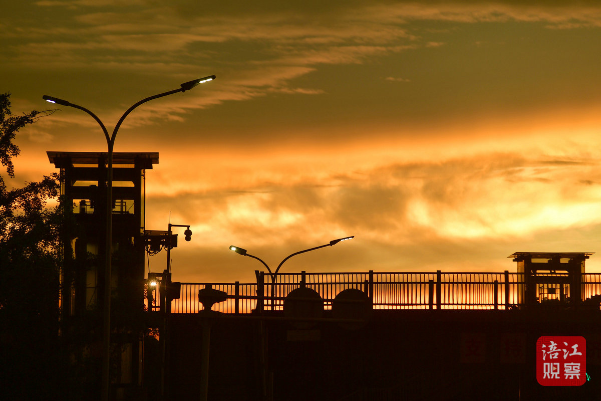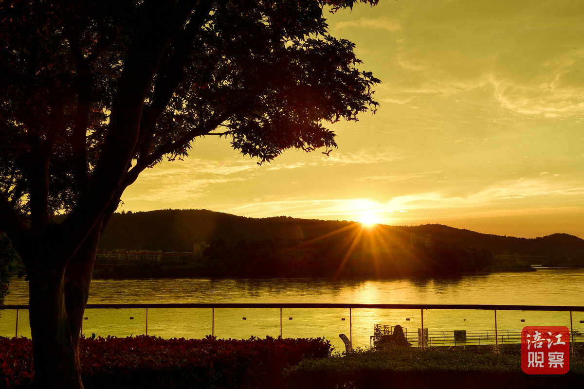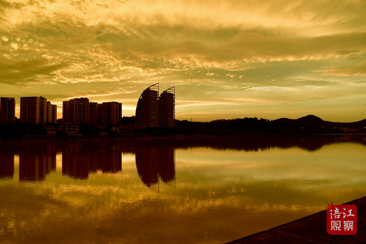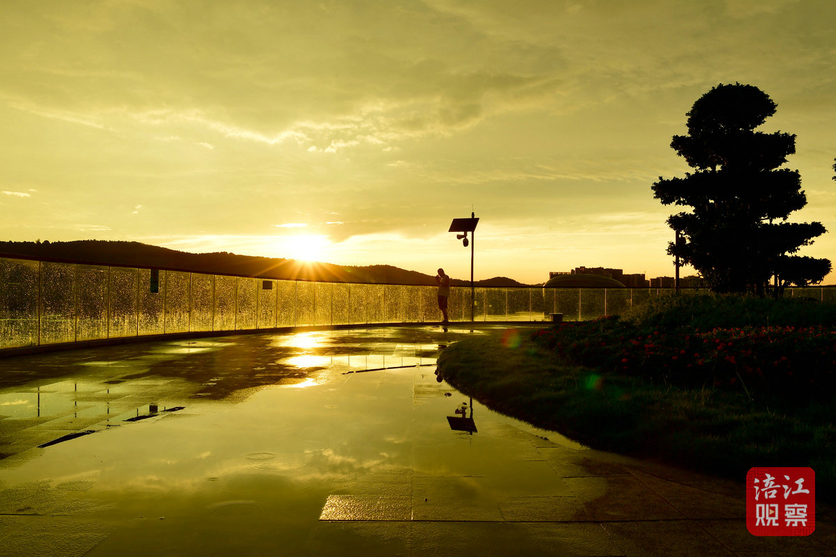 7月22日早上6時許,初升的太陽從東方冉冉升起,一時間霞光萬丈,把綿陽城區(qū)三江湖兩岸的樓宇、樹木、健身步道染上了一層金黃色,與短暫出現(xiàn)的彩虹相映成景,美不勝收。