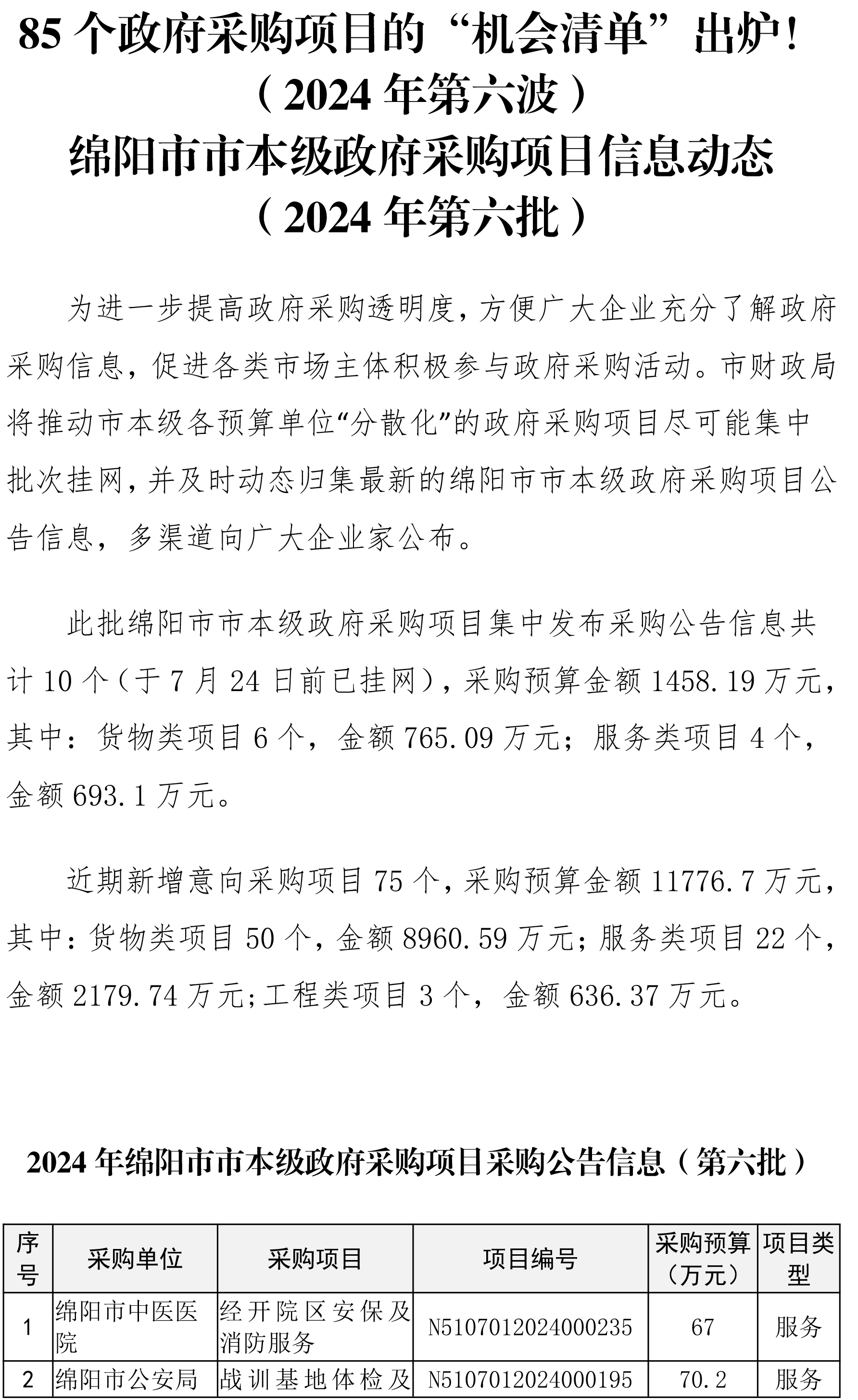 85個(gè)政府采購項(xiàng)目的“機(jī)會(huì)清單” 出爐!(2024年第六波)綿陽市市本級(jí)政府采購項(xiàng)目信息動(dòng)態(tài)(2024年第六批)