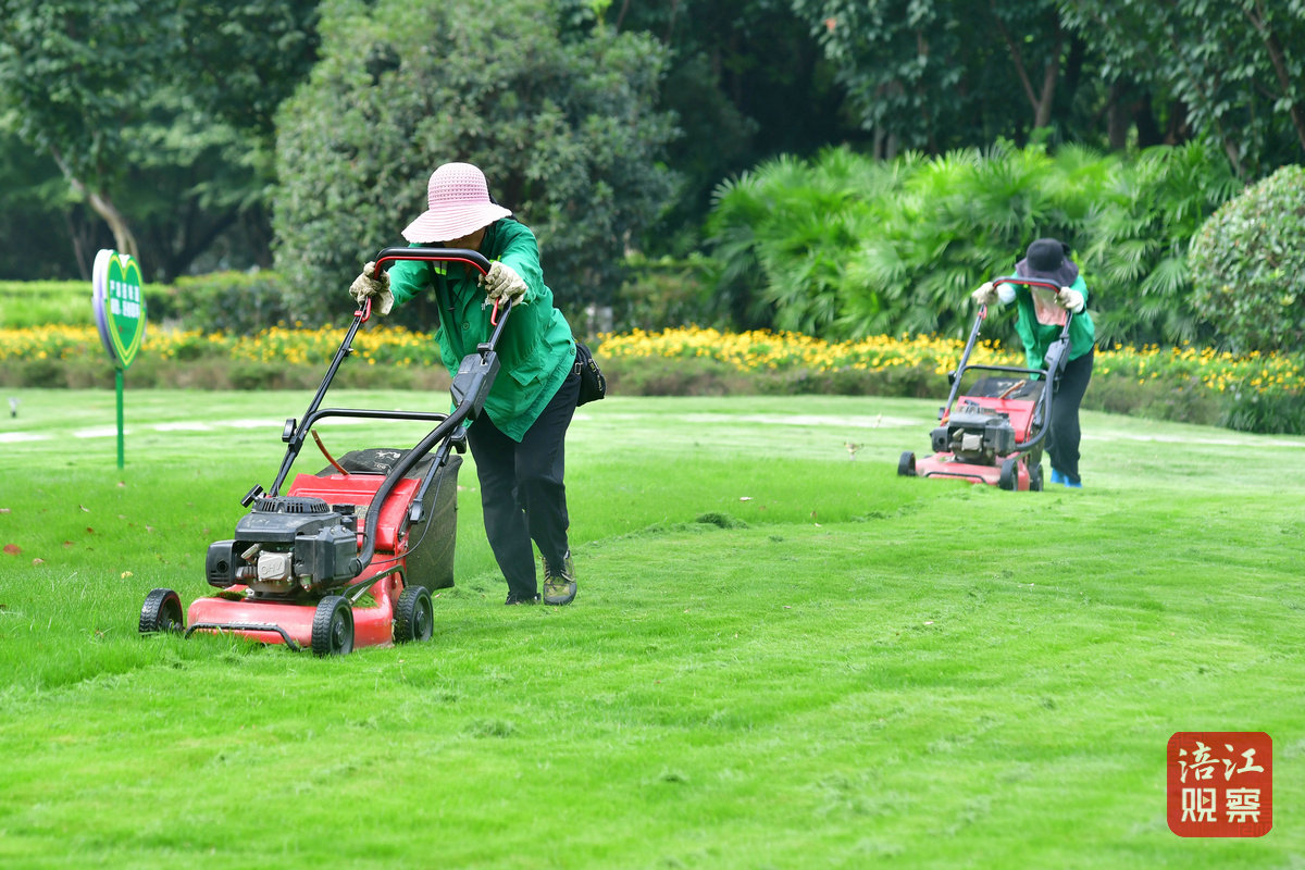 熱浪滾滾中,綠化工人正在修剪草坪。