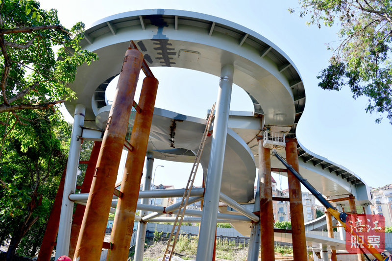 記者在沈家壩富樂小學人行天橋施工現(xiàn)場看到,這座天橋主體鋼結(jié)構(gòu)已架設完成。