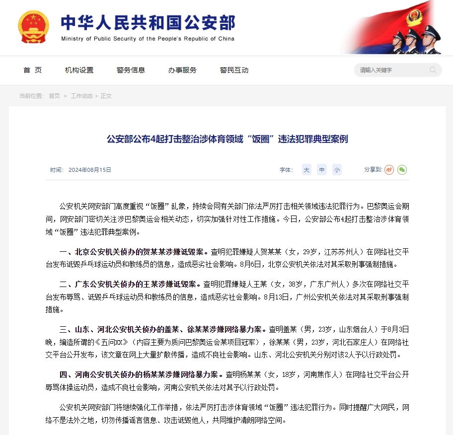 公安機(jī)關(guān)網(wǎng)安部門(mén)高度重視“飯圈”亂象,持續(xù)會(huì)同有關(guān)部門(mén)依法嚴(yán)厲打擊相關(guān)領(lǐng)域違法犯罪行為。巴黎奧運(yùn)會(huì)期間,網(wǎng)安部門(mén)密切關(guān)注涉巴黎奧運(yùn)會(huì)相關(guān)動(dòng)態(tài),切實(shí)加強(qiáng)針對(duì)性工作措施。今日,公安部公布4起打擊整治涉體育領(lǐng)域“飯圈”違法犯罪典型案例。