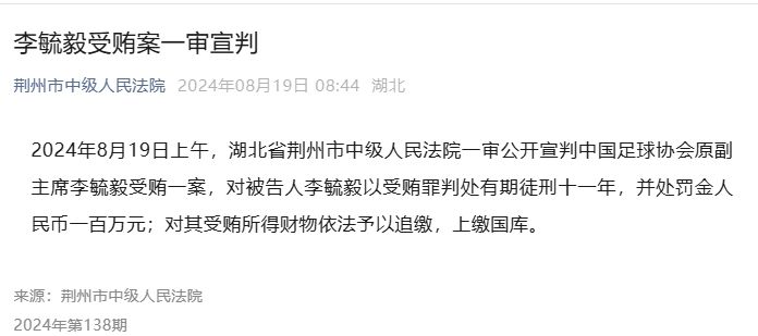 2024年8月19日上午,湖北省荊州市中級(jí)人民法院一審公開(kāi)宣判中國(guó)足球協(xié)會(huì)原副主席李毓毅受賄一案,對(duì)被告人李毓毅以受賄罪判處有期徒刑十一年,并處罰金人民幣一百萬(wàn)元;對(duì)其受賄所得財(cái)物依法予以追繳,上繳國(guó)庫(kù)。