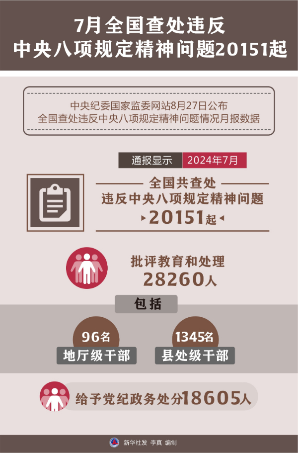新華社北京8月27日電(記者孫少龍)中央紀(jì)委國(guó)家監(jiān)委網(wǎng)站27日公布全國(guó)查處違反中央八項(xiàng)規(guī)定精神問題情況月報(bào)數(shù)據(jù)。通報(bào)顯示,今年7月,全國(guó)共查處違反中央八項(xiàng)規(guī)定精神問題20151起,批評(píng)教育和處理28260人(包括96名地廳級(jí)干部、1345名縣處級(jí)干部),給予黨紀(jì)政務(wù)處分18605人。