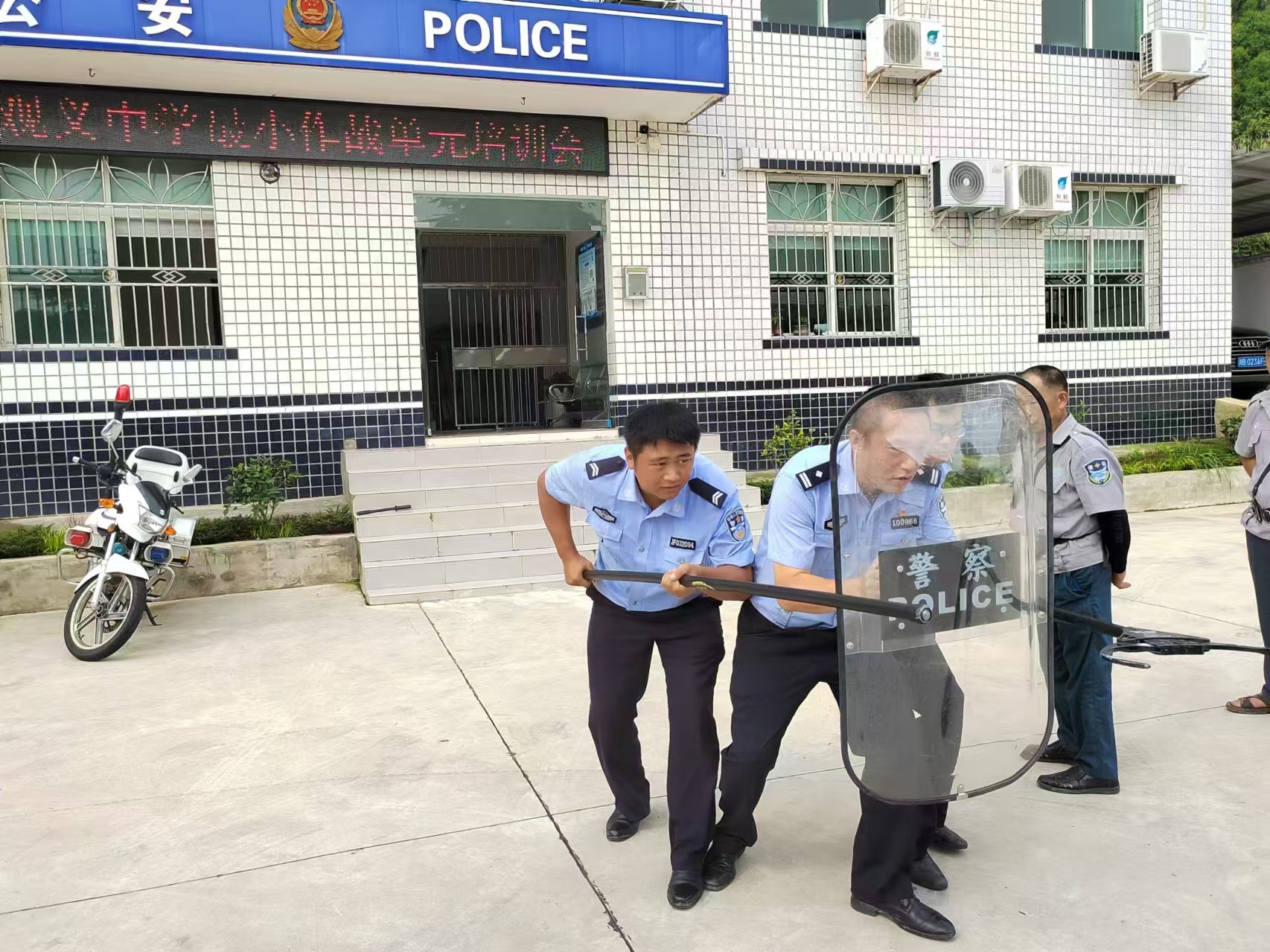 副所長(zhǎng)白國(guó)洪警官介紹了當(dāng)前反恐形勢(shì)的嚴(yán)峻性,并就如何提高校園反恐意識(shí)、有效預(yù)防和處理突發(fā)事件進(jìn)行了講解,對(duì)警械使用和防暴科目進(jìn)行了培訓(xùn),重點(diǎn)講解了如何在校門口這一關(guān)鍵區(qū)域做好安全防范工作。派出所警員現(xiàn)場(chǎng)講解展示了鋼叉、盾牌、辣椒水、防暴背心、防割手套、防爆毯等常用警務(wù)器材的功能和使用方法并與該校政教處人員、安保人員進(jìn)行了實(shí)戰(zhàn)演練,充分掌握并靈活運(yùn)用警務(wù)器材,使演練活動(dòng)圓滿結(jié)束。