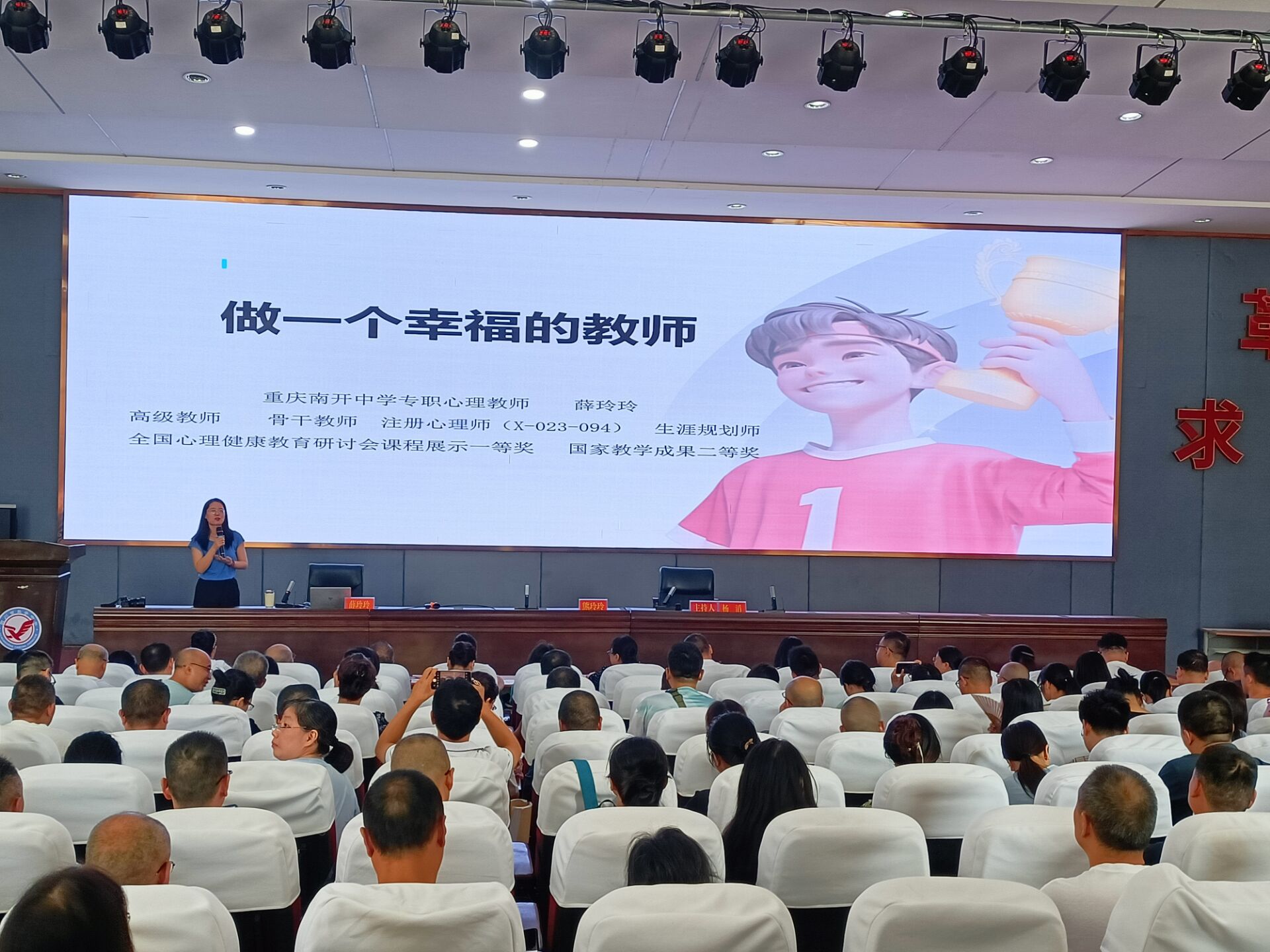 郭在時老師以《新課改背景下課堂質(zhì)量提升》為題,分析了新課改背景下課堂教學(xué)的現(xiàn)狀與面臨的挑戰(zhàn),并結(jié)合自己的多年的教學(xué)實踐經(jīng)驗,向老師們進行了深入淺出的講解。心理學(xué)專家薛玲玲老師以《做一個幸福的教師》為題,以自己多年從事學(xué)生心理工作的典型案例,向老師們闡述了如何釋放工作中的壓力,如何在職業(yè)倦怠中尋求自我成長與幸福感,如何幫助學(xué)生實現(xiàn)心理困境的突圍等一系列老師們極為關(guān)注的話題。