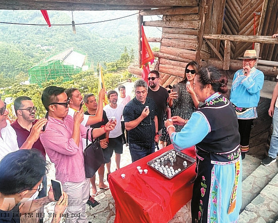在平武白馬祥述加山寨,白馬藏族姑娘、小伙兒唱起歡快的歌謠,歡迎旅行商代表一行。代表們走進民族特色鮮明的農(nóng)特館、民宿,欣賞織花腰帶、攆圓圓帽、鑿曹蓋面具等獨具民族特色的民俗表演。