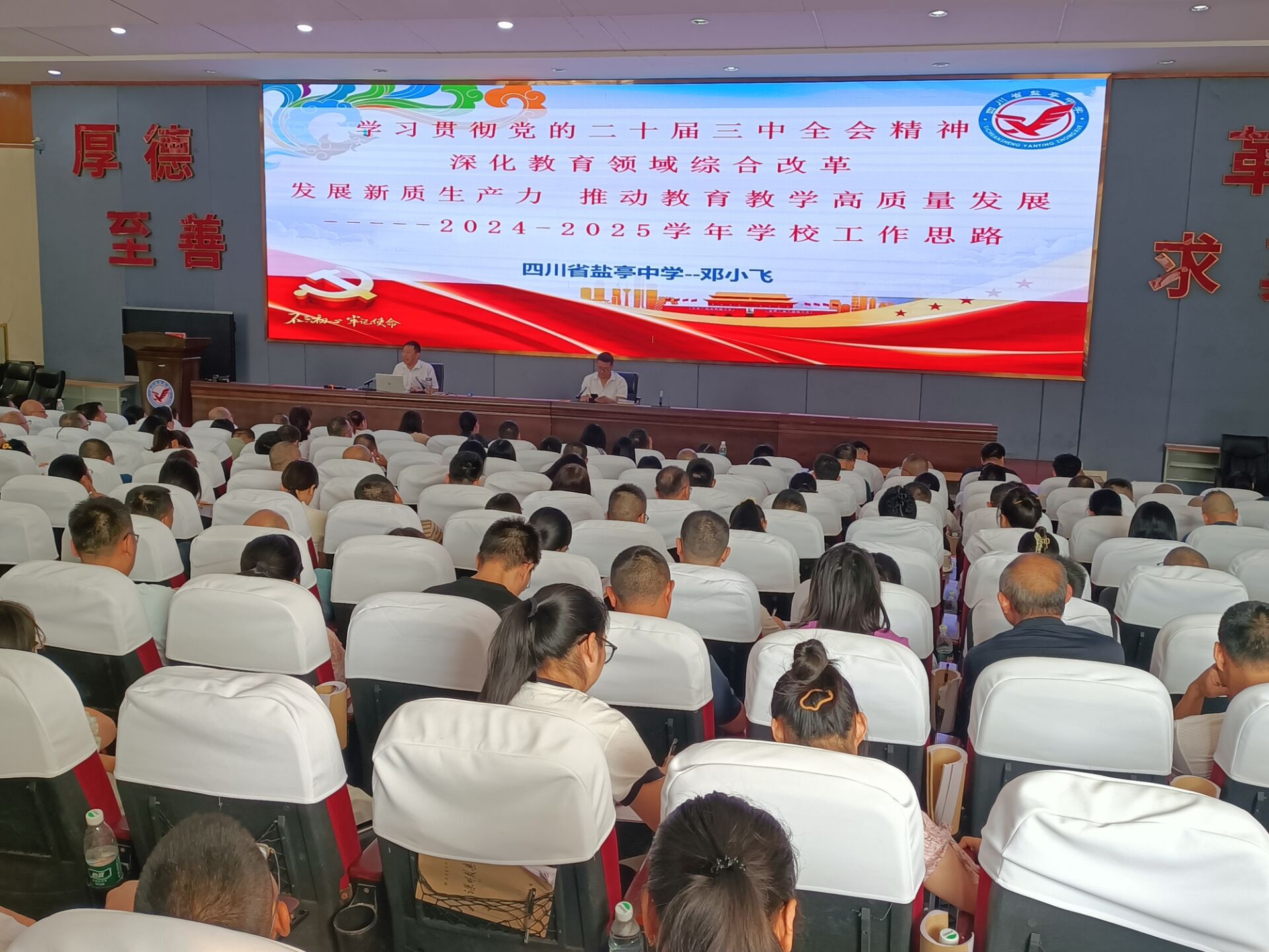 8月28日,鹽亭中學(xué)在校本部學(xué)術(shù)報(bào)告廳召開(kāi)了以“早謀劃勠力同心,譜新篇踔厲奮發(fā)”為主題的2024年秋季開(kāi)學(xué)工作會(huì)。包括文同創(chuàng)新實(shí)驗(yàn)校在內(nèi)的全體教職工參加了會(huì)議。會(huì)議由學(xué)校黨委書(shū)記張領(lǐng)先主持,校長(zhǎng)鄧小飛作了專題發(fā)言,學(xué)校其他校級(jí)行政領(lǐng)導(dǎo)也先后就自己分管的工作進(jìn)行了安排與部署。